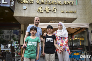 2014年6月6日,穆罕奈德和妻子刘芳(右一)、12岁的儿子刘飞翔(右二)、9岁的儿子刘义在自己经营的“花”餐厅前