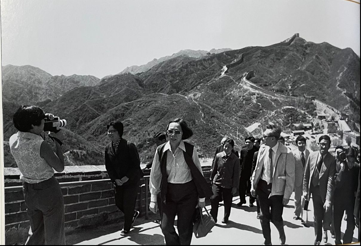 1976年5月13日,李光耀女儿玮玲(左)用她的电影摄像机捕捉李光耀一行访问中国长城的情景