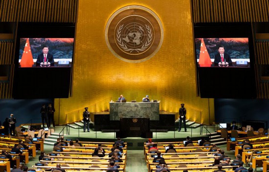 2021年9月21日,习近平在北京以视频方式出席第七十六届联合国大会一般性辩论并发表重要讲话。新华社记者王迎摄