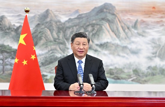 2021年11月4日晚,习近平以视频方式出席第四届中国国际进口博览会开幕式并发表题为《让开放的春风温暖世界》的主旨演讲。新华社记者 李学仁摄