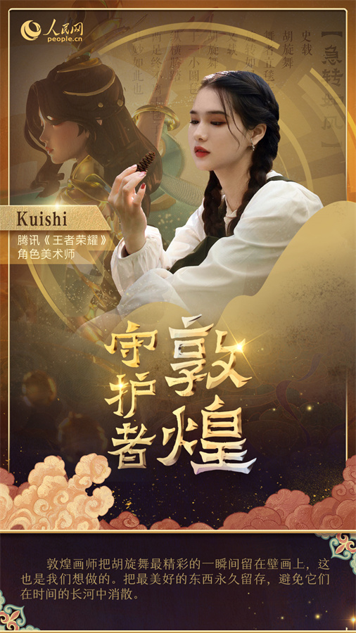 在敦煌千里之外的地方,腾讯的设计师们正在研发新的敦煌文化创新产品。热门游戏《王者荣耀》的角色美术师Kuishi以莫高窟第220窟的壁画为原型,为游戏角色设计了全新皮肤,将盛行于唐代的胡旋舞融入现代元素。