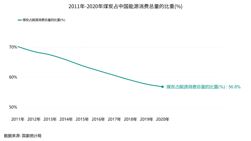 2011年-2020年煤炭占中国能源消费总量的比重(%) 。制图:崔译戈