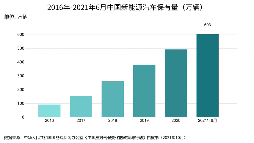 2016年-2021年6月中国新能源汽车保有量(万辆)。制图:崔译戈