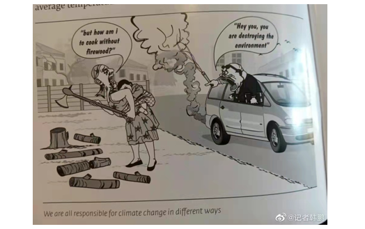 近日,中国驻美大使秦刚描述的一幅漫画,形象地展示了要求处于不同发展阶段的国家对气候变化承担相同责任的不公和荒谬。漫画中,一个衣衫褴褛、身材消瘦的人在拾柴烧火做饭,旁边一个大排量豪车的车主指着他说,“你烧火做饭的碳排放导致了全球变暖”。海外网友Ubong Essien说:“发达国家真是搞笑,它们偷走了资源、阻碍了发展,现在又在到处说气候变化。要想让我们跟你同等减排,先把我们的黄金、矿产和石油还给我们!”