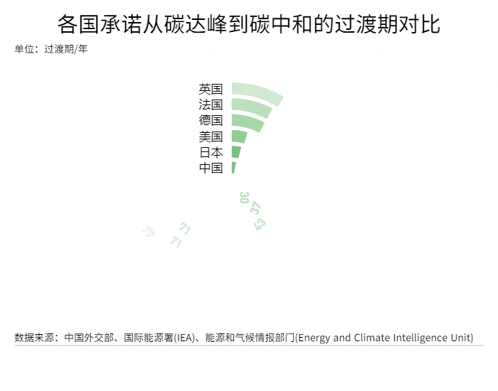 各国承诺从碳达峰到碳中和的过渡期对比 制图:崔译戈