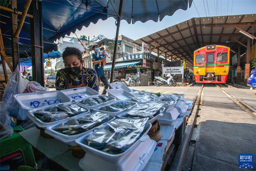 1月5日,在泰国沙没颂堪府美功县,商贩在美功铁道市场等待顾客。