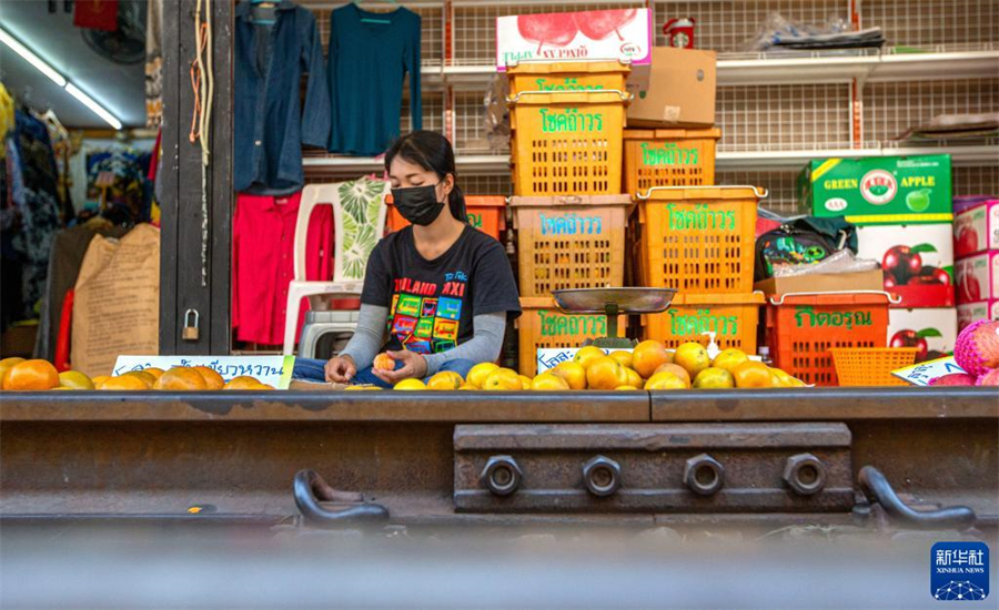 1月5日,在泰国沙没颂堪府美功县,商贩在美功铁道市场等待顾客。