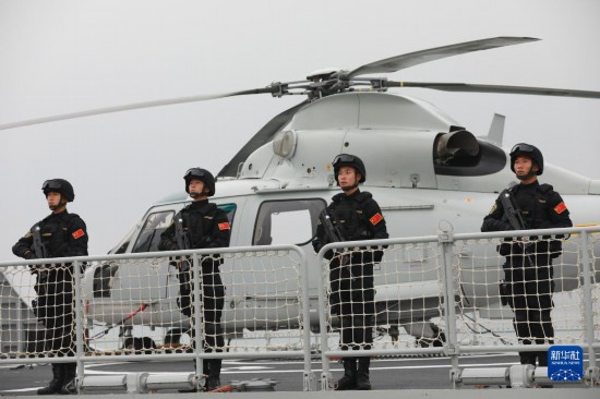 1月15日,中国海军第40批护航编队从广东湛江某军港解缆起航,特战队员在甲板上整齐列队。新华社发(江晓卫 摄)
