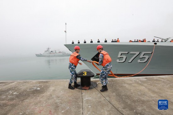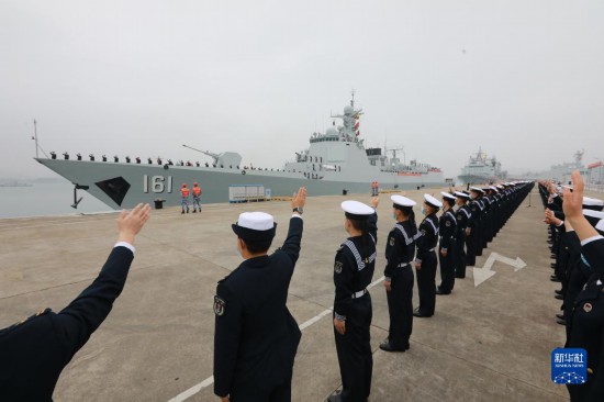 伴随着热烈的军乐声,编队舰艇依次解缆,驶离码头。甲板上,任务官兵整齐列队,精神抖擞,挥手告别。