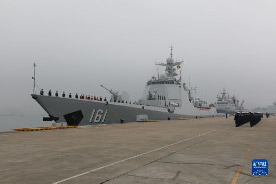 1月15日,中国海军第40批护航编队从广东湛江某军港解缆起航。这是编队中的导弹驱逐舰呼和浩特舰。新华社发(陈润楚 摄)