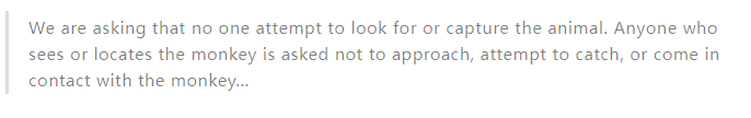 警方还在社交媒体推特上提醒民众:“任何看到或找到这些猴子的人都不要接近,不要试图捕捉或接触它们。”