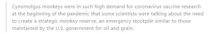 据《纽约时报》报道,这种来自非洲国家毛里求斯的猴子,经常用于临床毒理学研究,每只售价高达10,000 美元。在新冠疫情期间,这类猴子的需求量激增,以至于一些科学家正在谈论建立一个战略猴子储备的必要性,类似于美国政府的石油和粮食紧急储备。