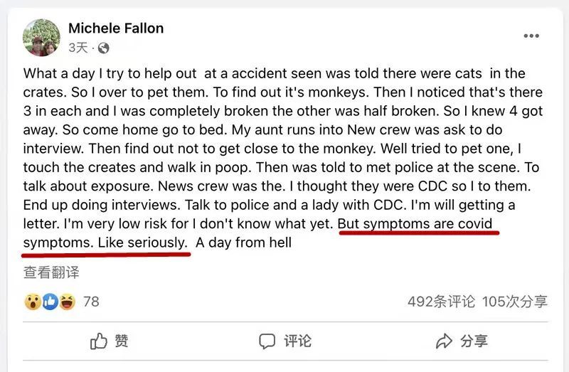 米歇尔告诉媒体,她在接触猴子后出现红眼、流涕、咳嗽等症状,由于手上有开放性伤口,已经就医。米歇尔称很担心从猴子身上感染了病毒。