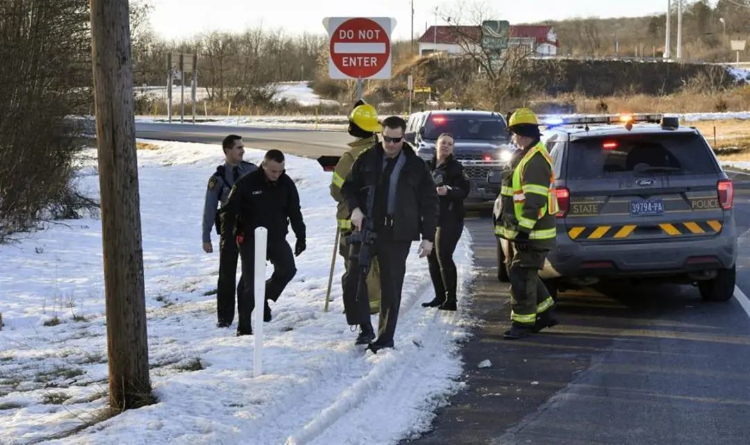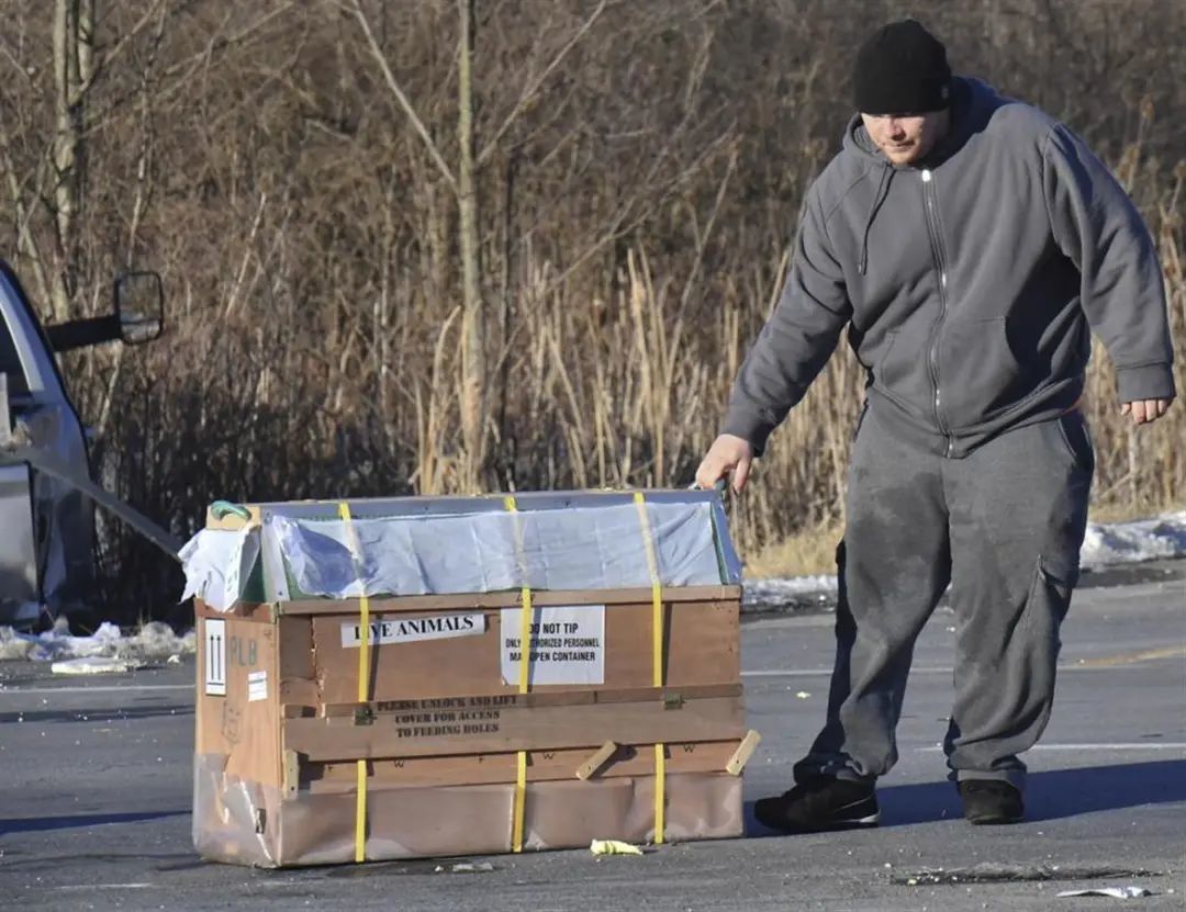 美联社发布的照片显示,事故现场多个板条箱散落在地,板条箱上写着“内有活物”字样。警方带枪展开搜寻。