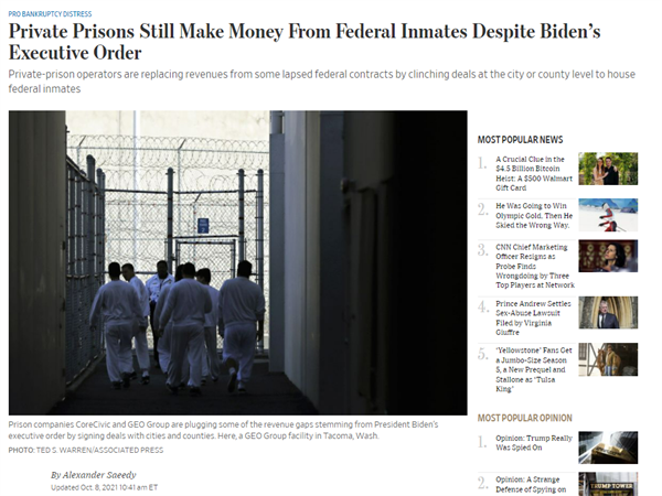 2021年10月,《华尔街日报》指出,拜登政府出台的行政命令并未阻碍美国私营监狱盈利。图片来源:《华尔街日报》官网截图