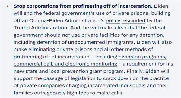 《拜登在司法领域的竞选承诺》(The Biden Plan For Strengthening America’s Commitment to Justice)节选:联邦政府将终止利用私营监狱;政府不再通过私营设施拘留包括未注册移民在内的民众。图片来源:拜登官方网站