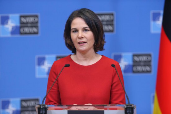 2021年12月9日,在比利时布鲁塞尔北约总部,德国外长贝尔伯克出席记者会。(新华社记者郑焕松摄)