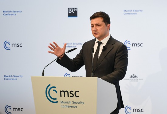 2月19日,在德国慕尼黑,乌克兰总统泽连斯基在慕尼黑安全会议上发言。(新华社记者逯阳摄)