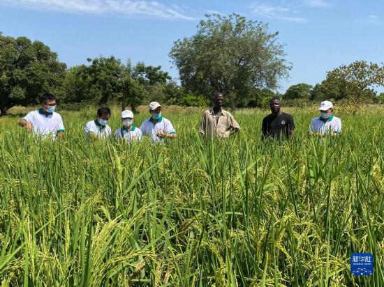 这是2021年7月13日,中国专家组成员在布基纳法索中西大区水稻示范区查看苗情。新华社发(中国农业组供图)