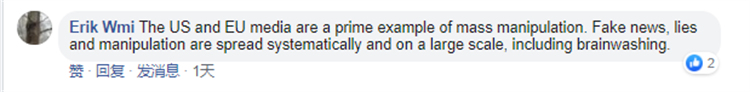 网友Erik Wmi在人民网英文社交媒体账号留言称:“美国和欧盟的媒体是大规模操纵的典范。假新闻、谎言被系统地、大规模地传播,给人们洗脑。”