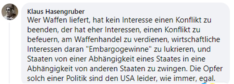 “他们希望战争继续下去以出售更多的武器。”德国网友也表示,美国是战争中唯一一个从各方获益的国家,包括经济、政治和战略层面。“可惜我们的政治家们既无能力也无意愿加以抵制。”海外网友道破美国在这场危机中的利益所在。