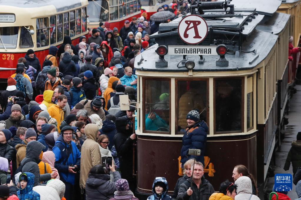 当日,莫斯科举行有轨电车游行活动,纪念有轨电车在莫斯科运行123周年。
