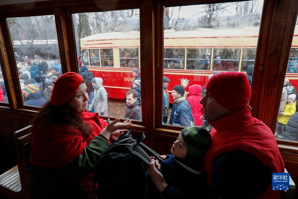 当日,莫斯科举行有轨电车游行活动,纪念有轨电车在莫斯科运行123周年。