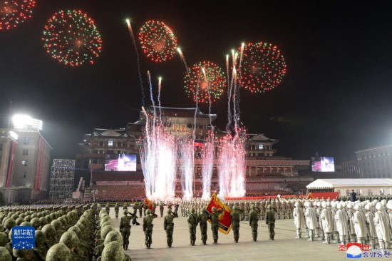 这张朝中社4月26日提供的图片显示的是朝鲜平壤举行阅兵式期间施放的焰火。新华社/朝中社