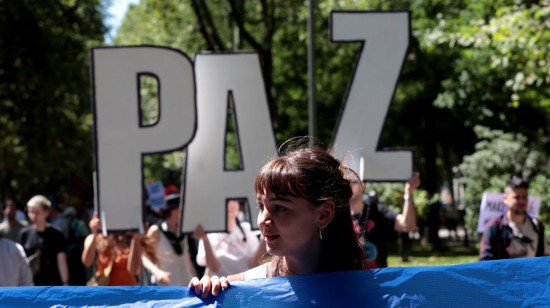 6月26日,数千人在西班牙首都马德里市中心参加反对北约、呼吁世界和平大游行。(新华社发,胡安·卡洛斯·罗哈斯摄)