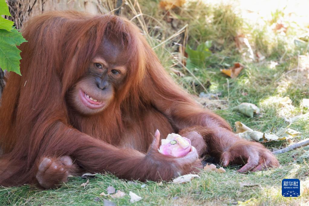 7月18日,在比利时布吕热莱特市天堂动物园,一只红毛猩猩享用“冰淇淋”。