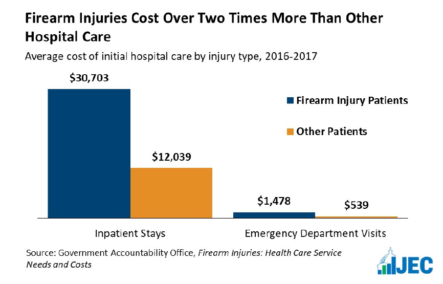 美国国会联合经济委员会报告显示,2016年至2017年涉枪伤害造成的平均初始住院医疗费用是其他类型治疗的两倍多。数据来源:美国政府问责局