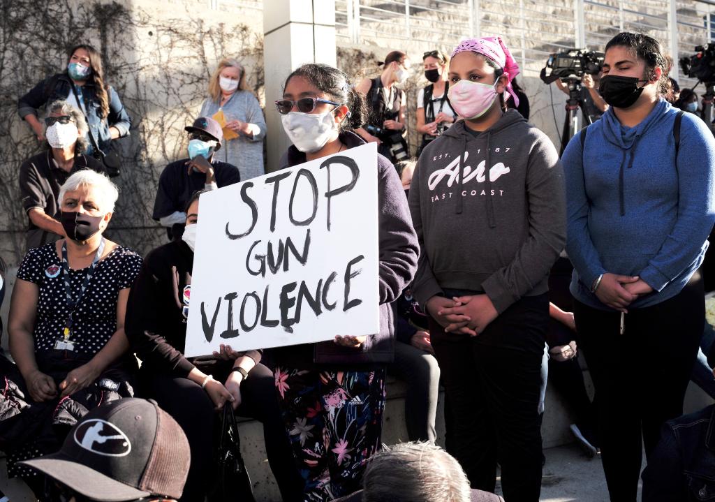 2021年5月27日,人们手举“停止枪支暴力”的标语在美国加利福尼亚州圣何塞市政厅广场参加枪击案受害者悼念仪式。新华社记者吴晓凌摄