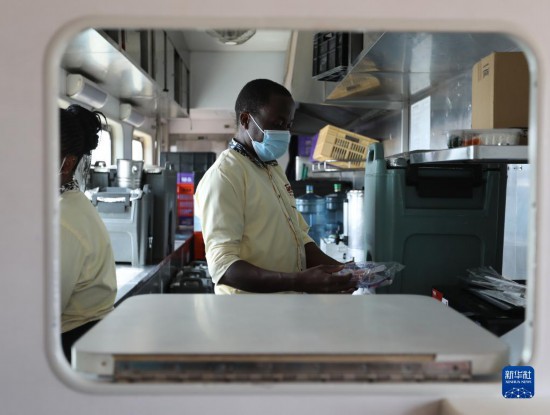7月29日,餐车员马克在肯尼亚蒙内铁路客运列车的餐车工作。