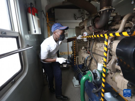 7月29日,发电车乘务员福斯汀在肯尼亚蒙内铁路客运列车上检查设备。