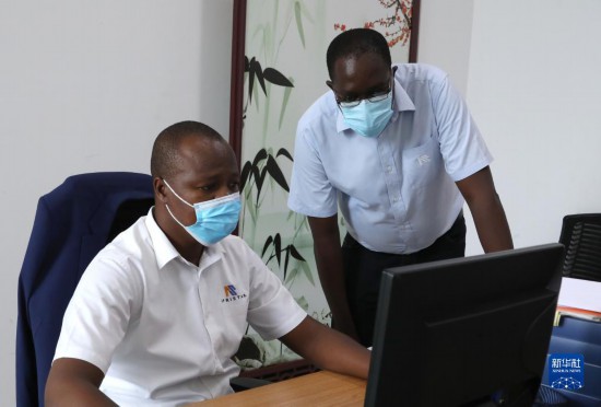 7月27日,肯尼亚蒙内铁路蒙巴萨终点站站长科斯马斯(右)与客运主任彼得森在办公室工作。