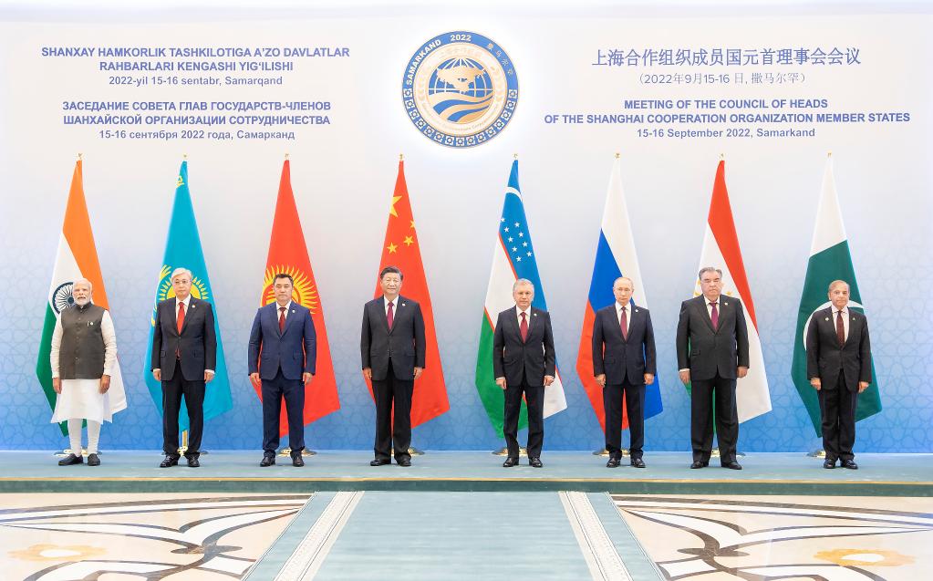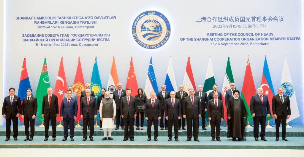 当地时间9月16日,国家主席习近平在撒马尔罕国际会议中心出席上海合作组织成员国元首理事会第二十二次会议并发表重要讲话。这是大范围会谈前,与会各方集体合影。新华社记者李涛 摄