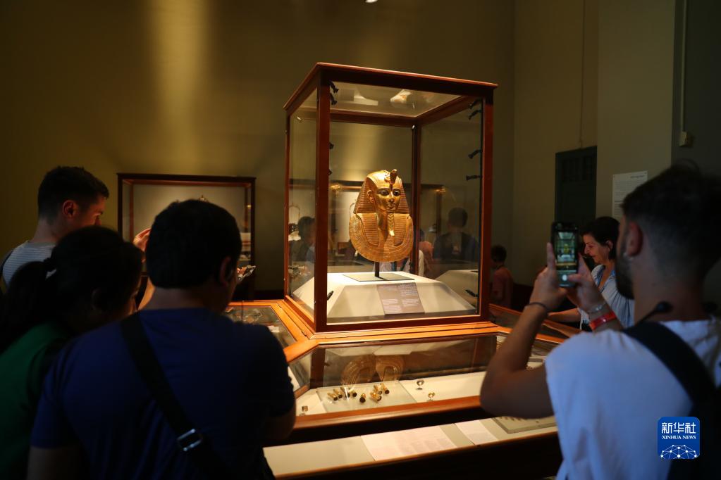 10月5日,在位于埃及开罗的埃及博物馆,游客拍摄法老苏瑟奈斯一世的金面具。