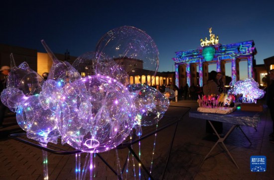 这是10月7日在德国柏林勃兰登堡门前拍摄的用彩灯装饰的气球。新华社发(斯特凡·蔡茨摄)