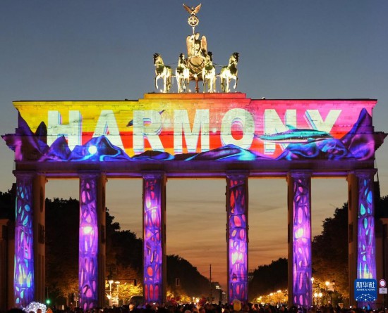 10月7日,德国柏林勃兰登堡门被灯光点亮。新华社发(斯特凡·蔡茨摄)