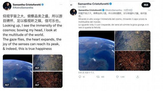 克里斯托福雷蒂在社交平台推特发文,用汉语、英语和意大利语引用《兰亭集序》的名句表达在太空的所见与所想。(推特截图)
