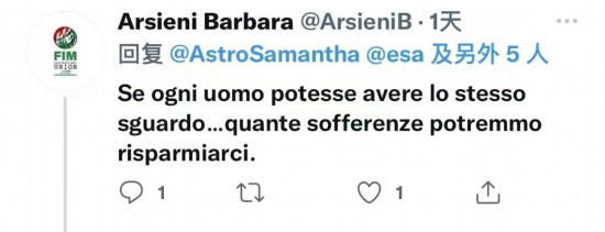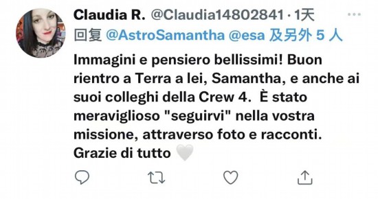 网友在克里斯托福雷蒂的推文下评论说,照片壮观,(分享的词句)意境绝美!克里斯托福雷蒂,祝您顺利返回地球,也祝Crew-4任务顺利。通过你们的照片和讲述“跟随”你们的太空之旅,感觉很美妙。谢谢!(推特截图)