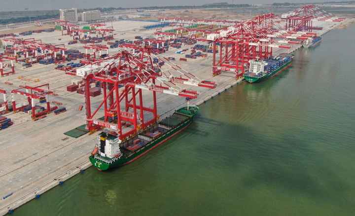 这是7月28日拍摄的广州港南沙港区四期全自动化码头(无人机照片)。 新华社记者 邓华摄