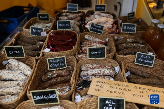 11月4日在比利时布鲁塞尔一市场拍摄的各类香肠。