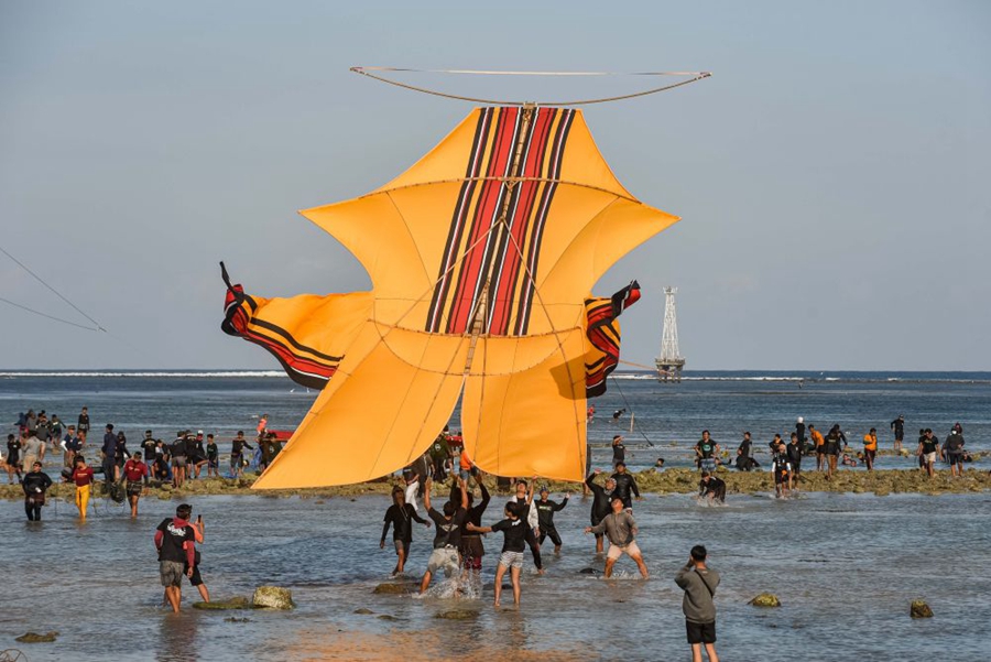 2022年7月31日,人们在印度尼西亚巴厘岛举办的风筝节上放当地传统风格的风筝。新华社发(比兴拉辛摄)