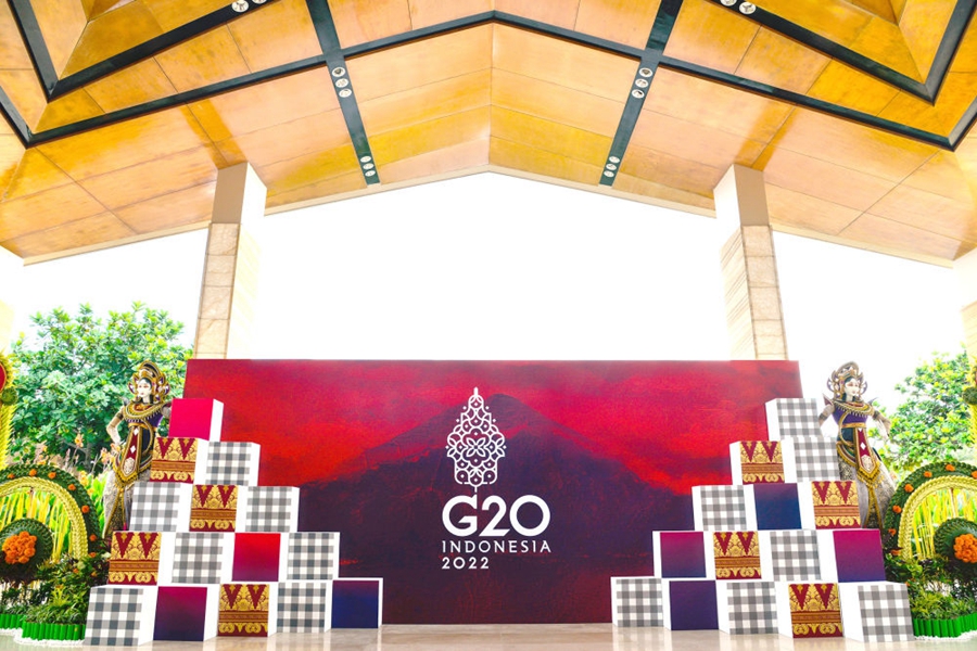 这是2022年11月11日在印度尼西亚巴厘岛二十国集团领导人第十七次峰会一处会场外拍摄的峰会标识和装饰。新华社记者 徐钦 摄