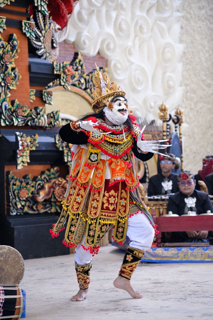 2022年7月10日,舞者在印度尼西亚巴厘岛一处文化公园表演传统舞蹈面具舞。新华社记者 徐钦 摄