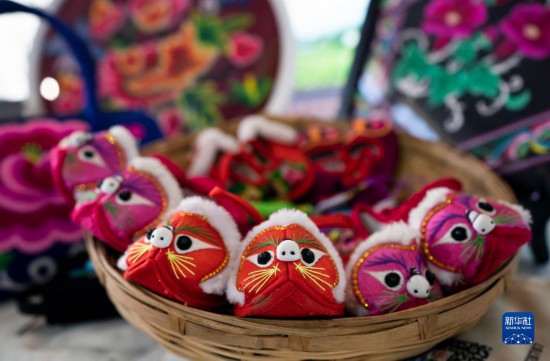 这是11月20日在南博会旅游文化馆内拍摄的彝绣虎头鞋。