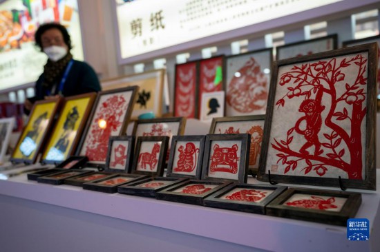 这是11月20日在南博会旅游文化馆内拍摄的非遗剪纸作品。
