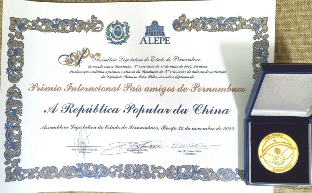 中国获“国际友好国家奖”奖状及奖章。中国驻累西腓总领馆供图