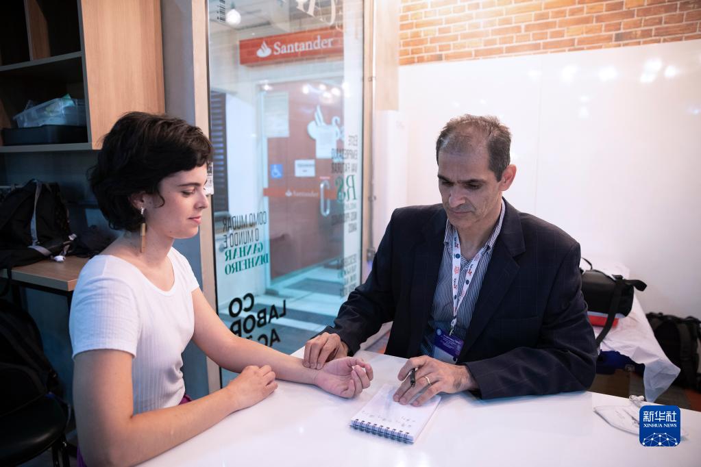 11月26日,在巴西圣保罗举行的世界中医药大会上,一名中医(右)为嘉宾把脉。